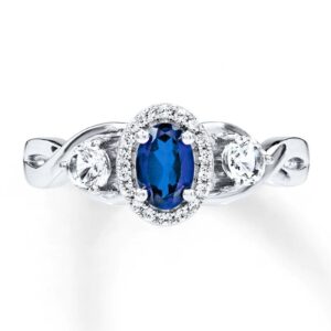 6.0mm Ruby and White Sapphire with 1/8 CT. T.W. Diamond Three Stone Bridal Set in 10K White Gold