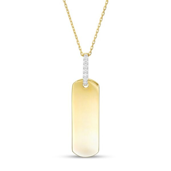 Wear your values with pride with this statement-making diamond pendant. Crafted in warm 10K gold, this petite tag features the word inscribed vertically along the center. Diamonds line the bail for a hint of sparkle. Captivating with 1/20 ct. t.w. of diamonds and a bright polished shine, this pendant suspends along a 16.0-inch cable chain with 2.0-inch extender that secures with a spring-ring clasp. This exclusive fine jewelry collection inspires you to wear your strength, confidence and power.