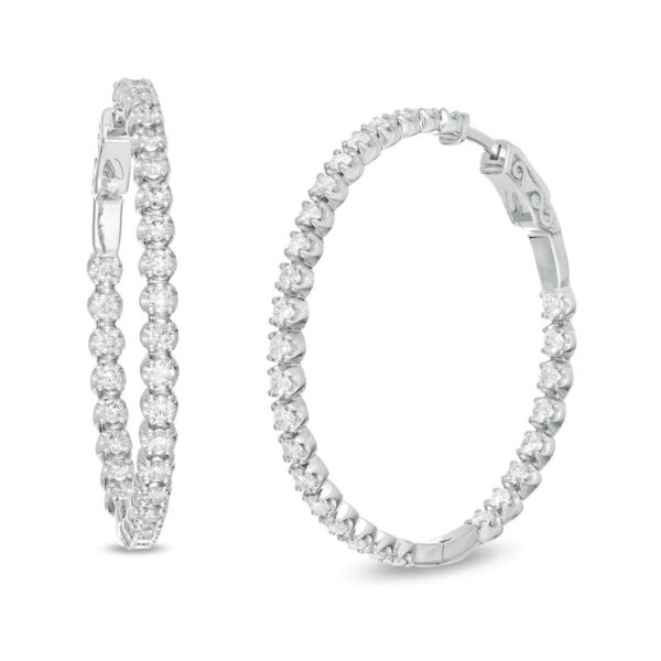 Add sparkle to your look with these gorgeous diamond hoop earrings. Crafted in cool 10K white gold, each exquisite earring features a row of 1/20 carat diamonds along the outer front and inner back edges, each set in a cupped four-prong setting. The earrings feature 3 carats of sparkling diamonds, polished to a brilliant finish, and fastened with a hinged back.