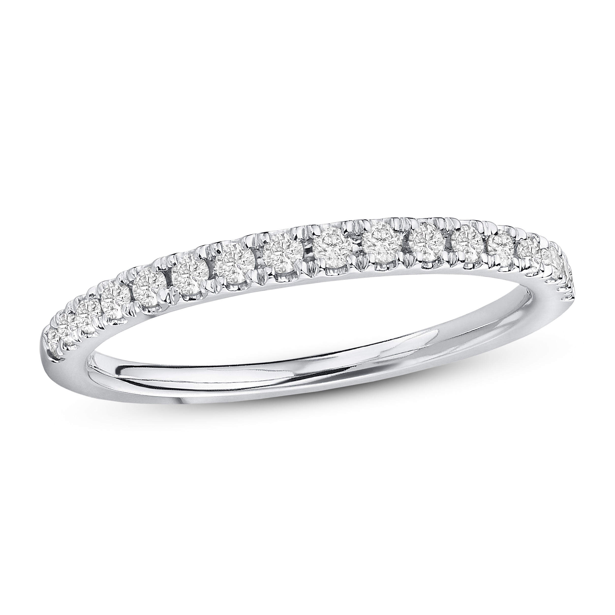 Sparkling round diamonds dance along this classic 10K white gold band for her. Ideal for an anniversary or wedding band, the ring has a total diamond weight of 1/4 carat.