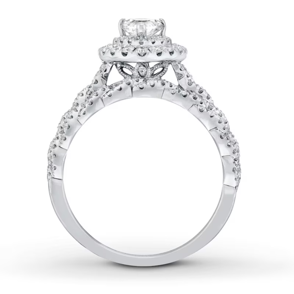 A gorgeous symbol of your love, this sparkling bridal; features an engagement ring with a romantic heart-shaped diamond haloed by glimmering round diamonds. The band and matching wedding ring are adorned with twists of round diamonds, bringing the total weight of the set to 7/8 carat. The ring is styled in 14K white gold.
