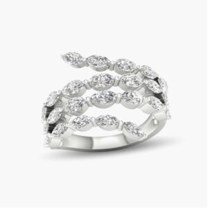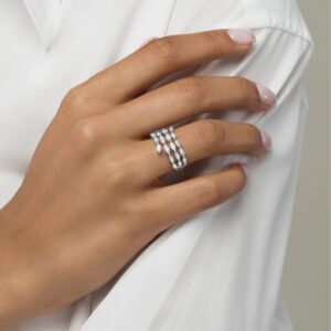 This resplendent engagement ring showcases a glamorous 3/4-carat princess-cut diamond framed in brilliant round diamonds. Three rows of round diamonds shimmer down the band, complemented by classic milgrain accents for a sophisticated look. The ring is styled in iconic 14K white gold and has a total diamond weight of 2 1/8 carats.