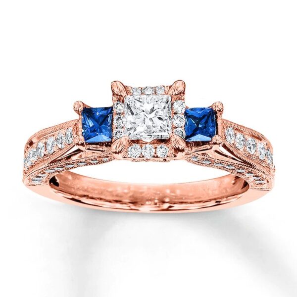 A princess-cut diamond is framed by round diamonds in the sparkling center of this gorgeous engagement ring. A square-cut natural sapphire adds color to each side of the center to complement. Round diamonds shimmer along the 14K rose gold band and profile, bringing the total diamond weight to 1 carat.