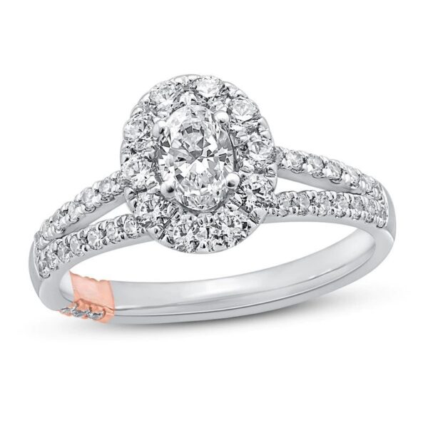 A haloed oval with split shoulders reminds us that it is always time for love in this exquisite women’s engagement ring from world renowned designer. Even more fiery round diamonds adorn the under gallery and envelop the split- shank band to complete the look. Fashioned in 14K two-tone gold, the total diamond weight of the ring is 1-1/8 carats.