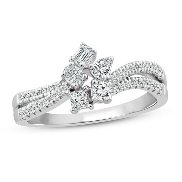 This enchanting diamond ring collection features five distinctively-shaped diamonds, symbolic of everything she means to you. Each diamond shape has a different meaning, from integrity and wisdom, to confidence, totality, and elegance. The beautiful 10K white gold ring features an oval-cut, emerald-cut, pear-shaped, round-cut, and princess-cut diamond at the center, while ribbons of brilliant round-cut diamonds flow outward. The gorgeous ring has a total diamond weight of 1/2 carat.