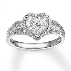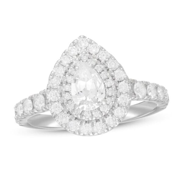 Collection comes this enchanting women’s engagement ring. The ring features a stunning pear-shaped diamond at its center, haloed by two rows of brilliant round diamonds. Additional round diamonds grace each side of the band, bringing the total diamond weight to 1 3/8 carats.The ring is fashioned in 14K white gold.