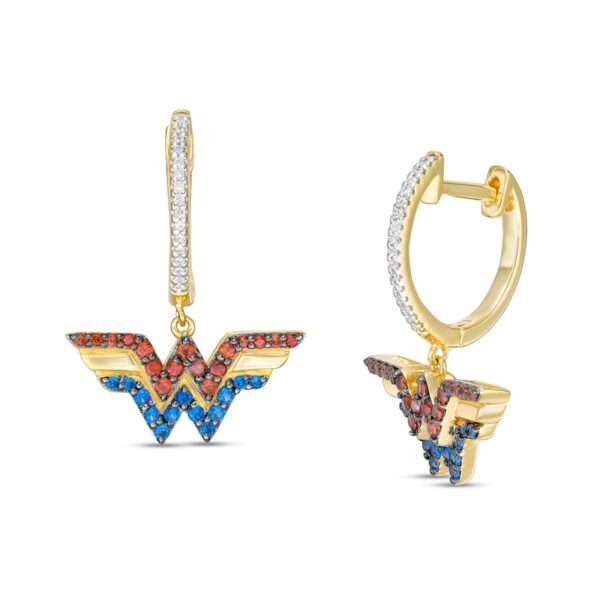 Express your epic style with these vibrant gemstone and diamond drop earrings. Crafted in warm 10K gold, each eye-catching drop features bright blue sapphires and regal garnets bringing color to the classic logo. Diamonds sparkle along the hoop above the dangle. Captivating with 1/15 ct. t.w. of diamonds and a brilliant buffed luster, these earrings secure with hinged backs. This exclusive fine jewelry collection inspires you to wear your strength, confidence and power.